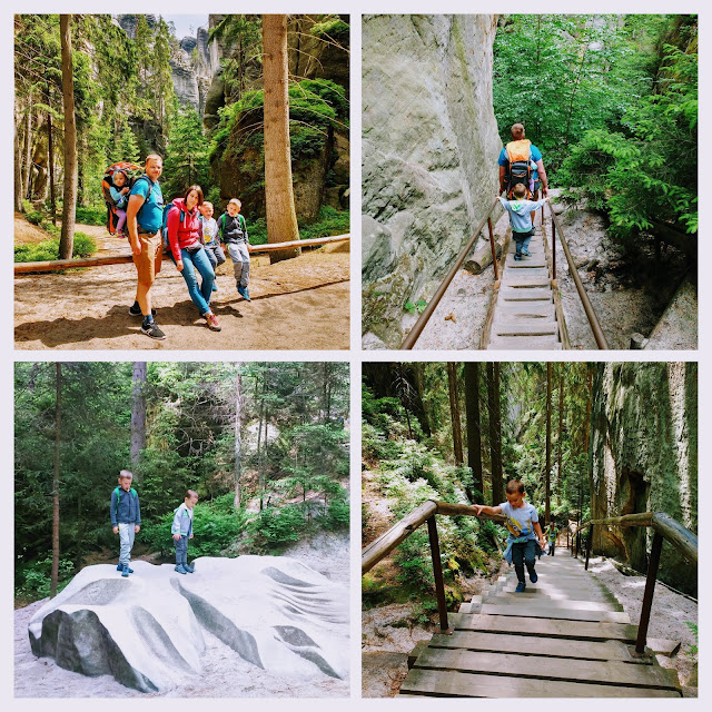 O Skalnym Mieście słyszeliśmy i czytaliśmy same dobre opinie (np. na Kołem się toczy, u Wędrownych motyli czy u rodziny Szewczyków z Kasai.eu), a będąc bardzo zadowoleni wędrówką po Szczelińcu Wielkim nastawialiśmy się na jeszcze ciekawsze doznania. Jako, że dzieci do 6 lat mają wstęp wolny, kupiliśmy tylko dwa normalne bilety po 70 koron i weszliśmy na szlak.